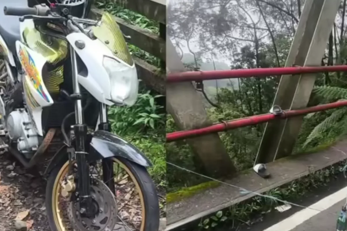 Video lain menunjukkan pria yang sama berada di atas sepeda motornya di area jembatan. Ia tampak memeriksa atau membenahi kendaraannya yang terparkir di sisi jalan.