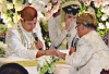 Nino, yang dikenal sebagai salah satu vokalis grup musik RAN, tampil gagah dalam balutan busana pengantin tradisional. Ia terlihat mengenakan beskap berwarna putih lengkap dengan keris yang terselip di punggungnya, simbol kekuatan dan tradisi dalam adat Jawa. Penampilan elegannya menambah kesan sakral pada momen penting dalam hidupnya itu.