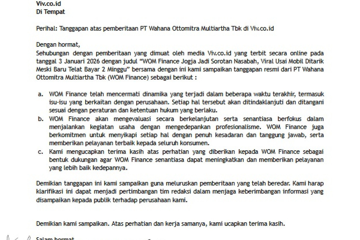 Sehubungan dengan pemberitaan pada tanggal 3 Januari 2026 dengan judul “WOM Finance Jogja Jadi Sorotan Nasabah, Viral Usai Mobil Ditarik Meski Baru Telat Bayar 2 Minggu”.
